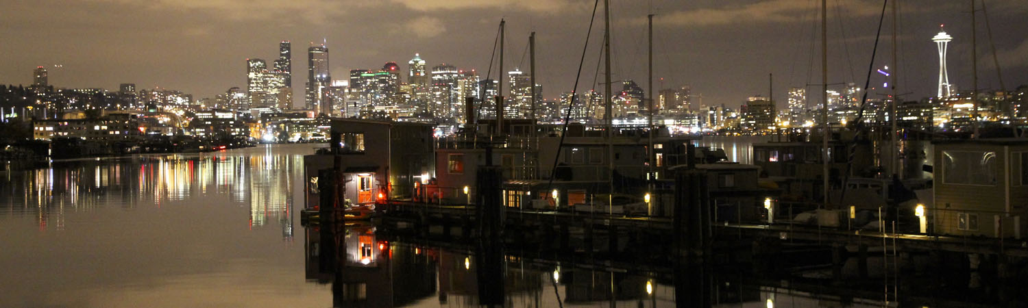 Seattle skyline at night on Lake Union